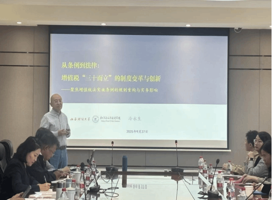 会议第二阶段在图书馆东馆二层会议室举行,由冯杰副教授主持,山西财经大学财政与公共经济学院冷永生副教授作题为《从条例到法律:增值税“三十而立”的制度变革与创新》的专题报告,以兼具经济学与法学的双重视角,围绕“立法进程与立法技术分析”“增值税法与实施条例的体系关系”“实施条例十大规则重构与争议分析”“税务律师的业务机会与执业建议”四大维度,分享内容兼具专业性与实用性,引发与会者的热烈讨论。