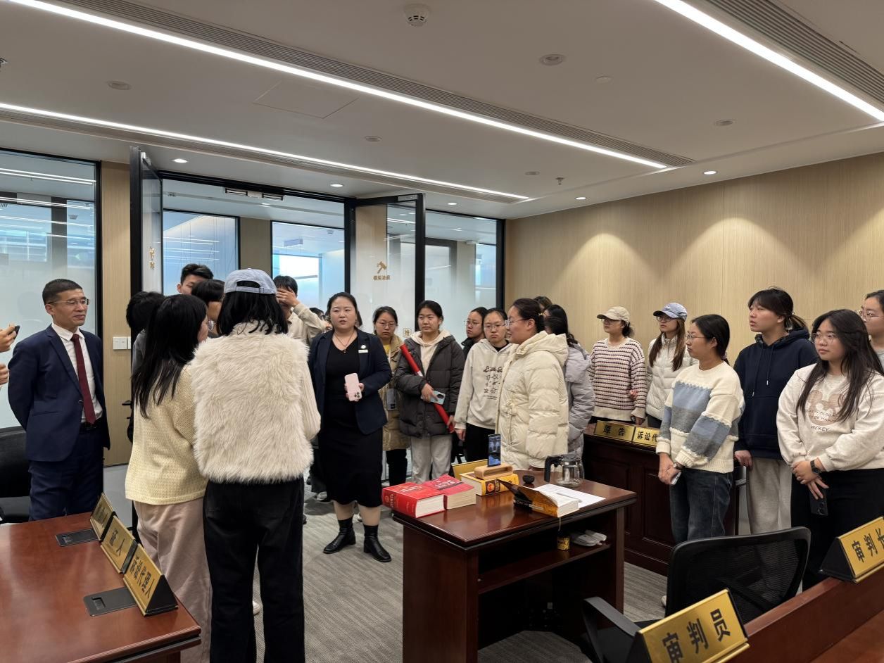 活动伊始,在盈科律所工作人员的引导下,学生们有序参观律所办公环境。从现代化的律师办公区到功能齐全的模拟法庭,从规范有序的案件档案室到氛围庄重的客户接待区,每一处细节都彰显着律所的专业化与规范化。工作人员结合律所发展历程,详细介绍其业务领域、团队架构及案件办理流程,尤其分享了律师的日常工作节奏与流程,让学生们对“律师如何运用法律知识解决实际问题”有了直观认知,打破了课本理论与实务操作之间的“壁垒”。